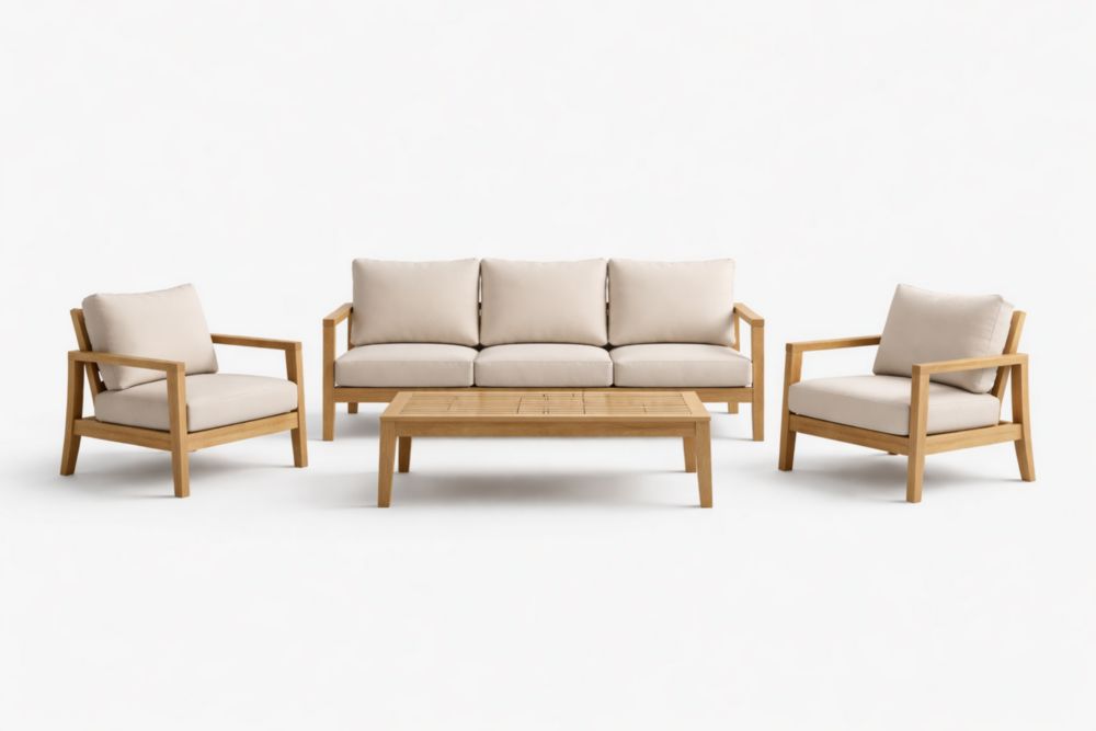 4-Piece Patio Furniture Set Teak Wood Beige Cushions with Sofa Armchairs Coffee Table