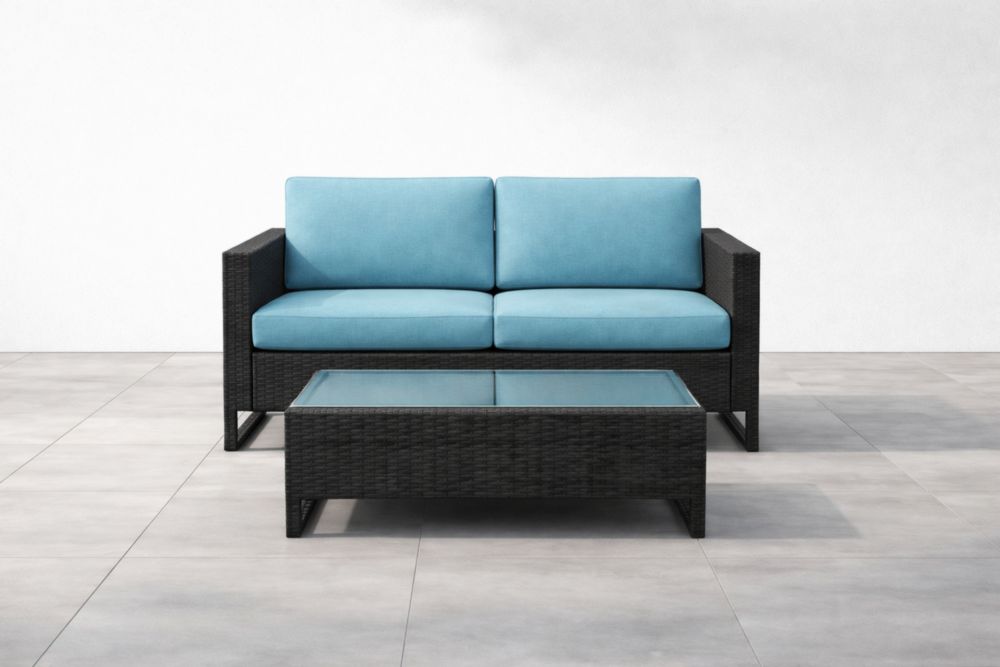Rattan Wicker Sofa and Tempered Glass Coffee Table Set with Blue Cushions
